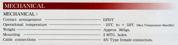 This is a new, in original box, with documentation Tohtsu CX-800N DPDT type coaxial antenna relay with N connectors at each port. The relay is 50 ohms and has a 12 vdc activation coil. The relay is normally used as a transmit receive relay for a base station or as a drop-out relay on a power amplifier. This is new surplus inventory from the two way radio shop at Henry Radio in Los Angeles, California. Shipping anywhere in the continental US is FREE. International shipping will be quoted on request.