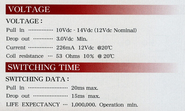 Pull in: 10 Vdc - 14 Vdc (12 Vdc Nominal)